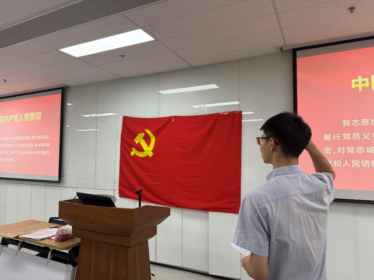 议程第六项,支部党员重温入党誓词。全体成员右手握拳,高举过肩,面向党旗,齐声宣誓。“我志愿加入中国共产党……随时准备为党和人民牺牲一切,永不叛党”,一句句誓言坚定有力,在教室内回荡。通过此次重温入党誓词环节,支部党员进一步强化了党性修养,表示要以更高的标准严格要求自己,发挥先锋模范作用,为党和人民的事业不懈奋斗。