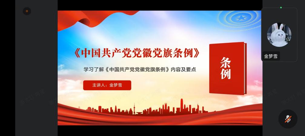 为提升对中国共产党党徽、党旗使用的规范意识、深入学习贯彻中央八项规定精神,筑牢廉洁自律思想防线,浙江大学马克思主义学院硕士生第三党支部于8月24日以钉钉会议方式开展主题党日活动。全体党员同志参加此次活动,活动由金梦雪同志主持。