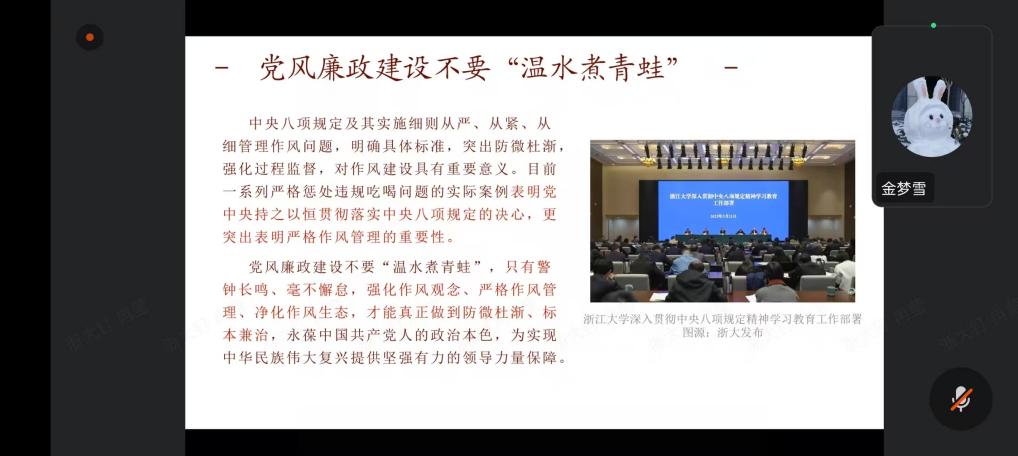 随后,金梦雪同志带领支部党员深入学习陈宝胜教授《党风廉政建设不要温水煮青蛙》一文。围绕文章核心观点,金梦雪同志强调党风廉政建设绝非“一阵风”,而是需要党员时刻保持警醒,警惕“小问题”演变成“大错误”,坚决抵制各种歪风邪气的侵蚀。她表示,希望以此次文章学习为契机,带动支部全体党员进一步深入领会中央八项规定精神的内涵与要求,自觉将廉洁自律意识融入日常学习与生活。同时,她鼓励支部党员围绕党风廉政建设相关文章、对策建议等内容加强内部交流,形成“互学互鉴、共同提升” 的良好学习氛围,推动作风建设走深走实。