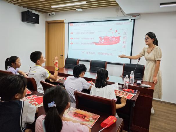 宣讲员连悦聚焦“红船”这一标志性革命文物,通过投影播放历史影像、展示红船模型,还原1921年的建党历程:“上海望志路会议突遭巡捕搜查,王会悟提议转移嘉兴南湖。代表们扮成游客,带着文件登上红船。”