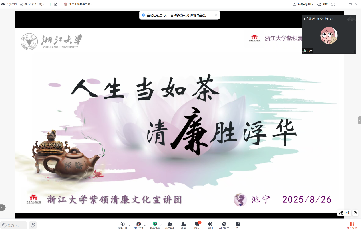 活动第一项,浙江大学紫领清廉文化宣讲团宣讲员池宁同志作《人生当如茶 清廉胜浮华》主题宣讲,以茶为喻,深刻阐释清廉内涵。她首先追溯了茶与廉的深厚历史渊源:周武王以茶设宴显简朴,陆纳以茶代酒明操守,彭德怀公茶私茶相分明,皆印证茶已超越饮品本身,成为彰显清廉品格的象征。随后,她以制茶工序作比,阐述守廉之道。从采青、晒青、做青到杀青、揉捻、烘干,一杯好茶需经层层淬炼。她强调,坚守清廉亦如制茶,需时刻保持清醒自律,经受住各种诱惑考验。最后,池宁以茶的“苦涩回甘”喻人生抉择。面对诱惑时,“收下”则破底线,“拒绝”或有暂时损失,但清廉带来的“回甘”更值得珍惜。人生当如茶,“拿起”责任担当,“放下”贪念欲望,不断修炼内心,提升个人品格。