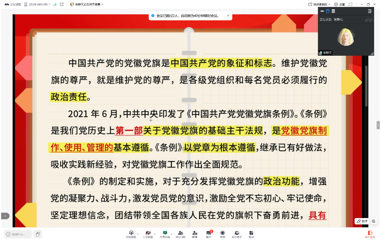 活动第二项,支部党员张静文同志领学《中国共产党党徽党旗条例》。她围绕条例的背景意义、核心条款及实践要求展开深入解读,系统梳理了党徽党旗的样式规范、制作使用原则及禁止性规定,着重强调中国共产党的党徽党旗是中国共产党的象征和标志,党的各级组织和每一个党员都要维护党徽党旗的尊严,自觉规范使用党徽党旗。