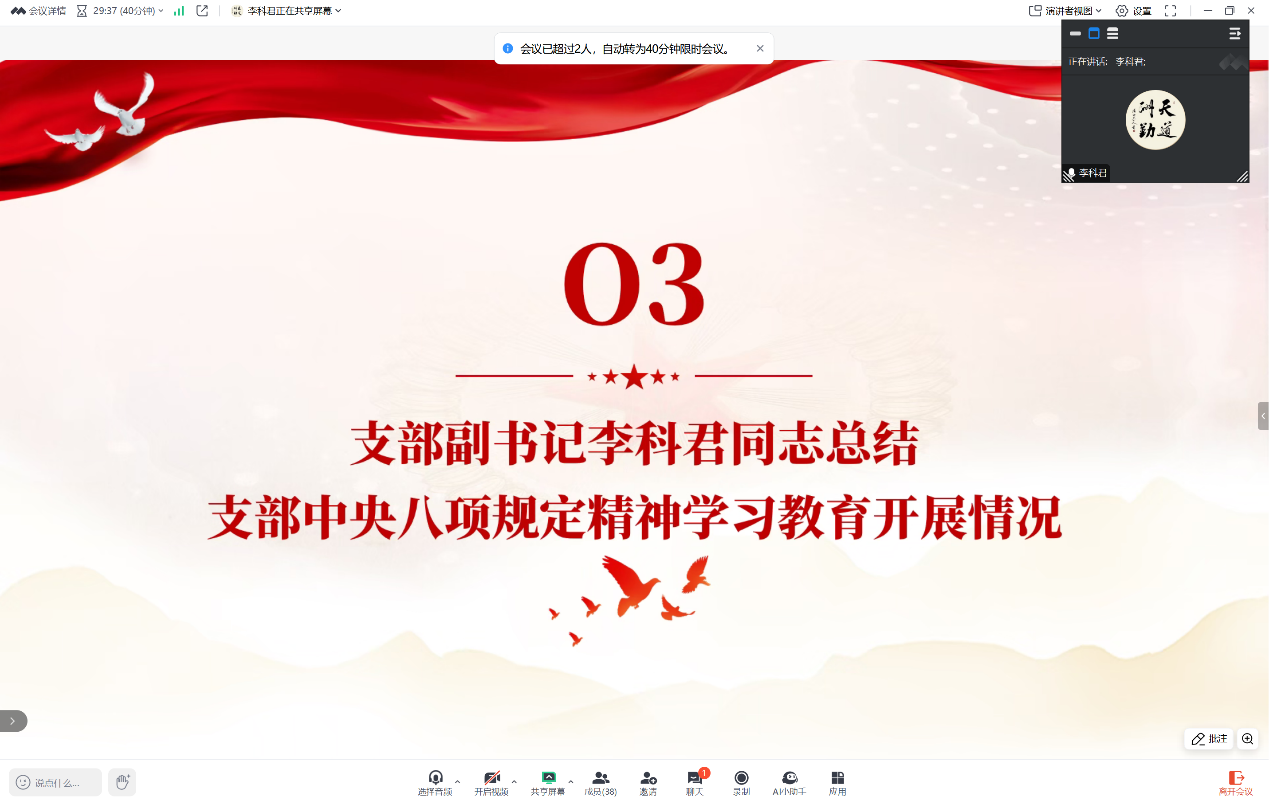 为推动中央八项规定精神学习教育走深走实,强化支部党员对党徽党旗的认知,8月26日晚,硕士生第二党支部线上开展“品清茶之韵·守清廉之风”主题党日活动。活动由党支部副书记李科君同志主持。