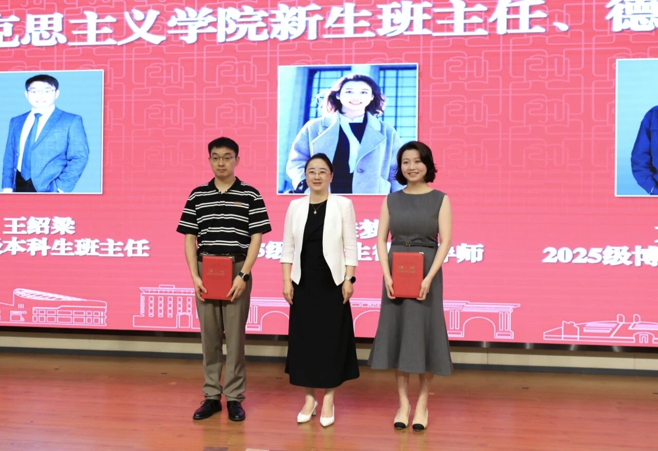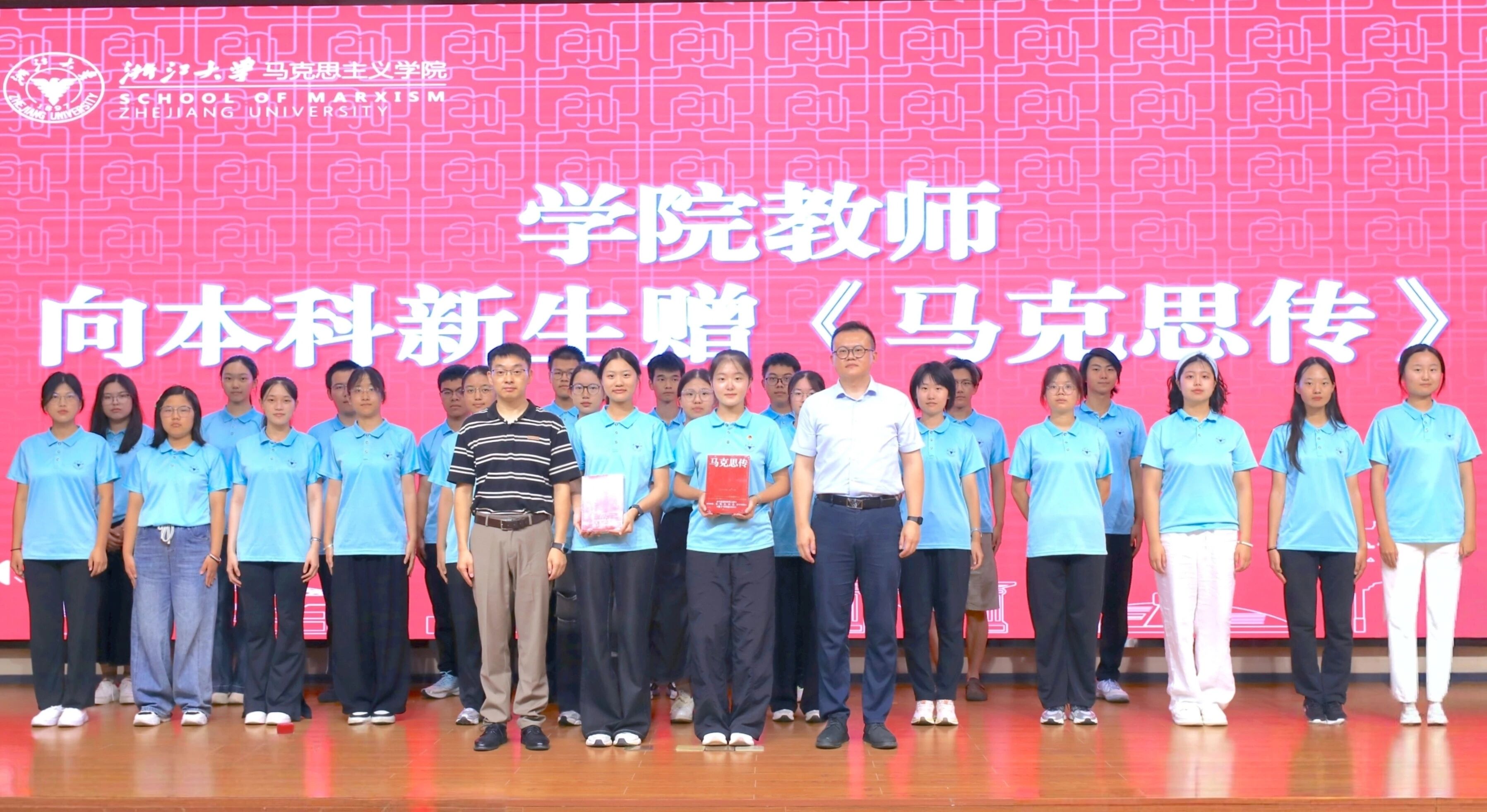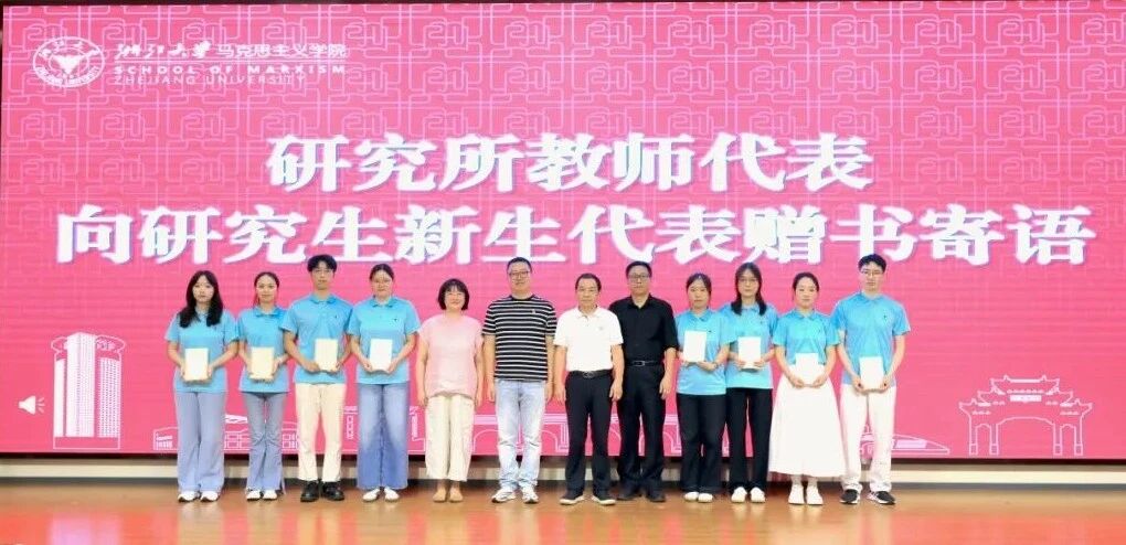 副院长包大为与班主任王绍梁共同向本科新生代表赠送《马克思传》;陈宝胜、段治文、吴旭平、董扣艳老师分别代表各研究所向研究生新生赠书寄语,勉励同学们从经典著作中汲取智慧与力量。