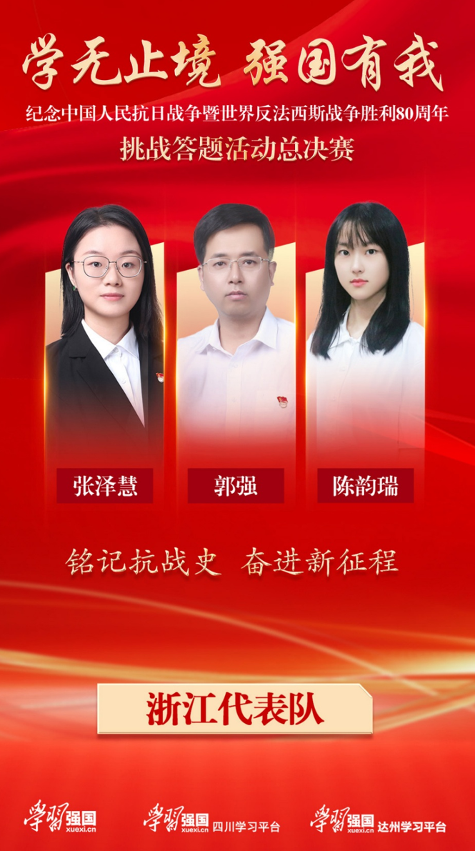 本次赛事汇聚全国28个省级学习平台的代表队上演巅峰对决。各队选手知识储备扎实,临场反应敏捷,比赛过程精彩。我院2023级思想政治教育专业研究生张泽慧凭借深厚的知识储备、出色的临场应变能力与稳定的竞技心态,以浙江省代表队核心成员身份参赛,全程展现我院学子的过硬素养与精神风貌,最终助力浙江省代表队荣获全国总决赛三等奖!
