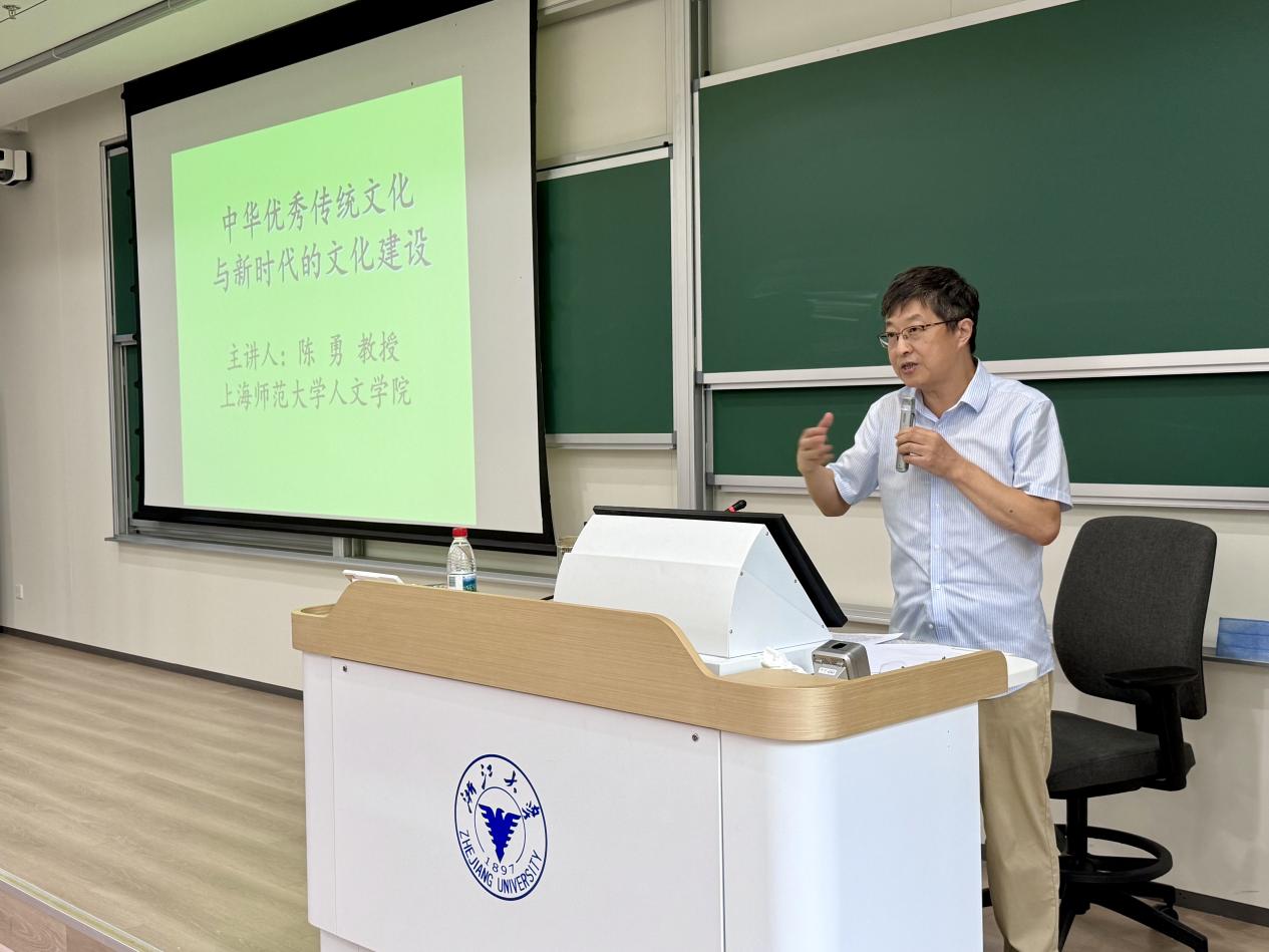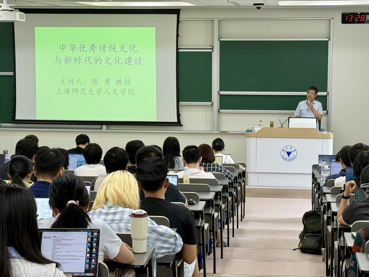为深入学习与感悟中华优秀传统文化的魅力,增进同学们的文化自信与文化认同,10月13日下午,上海师范大学人文学院陈勇教授走进“新时代中国特色社会主义理论与实践”课堂,作题为“中华优秀传统文化与新时代的文化建设”专题讲座。现场共有师生150余人参加。