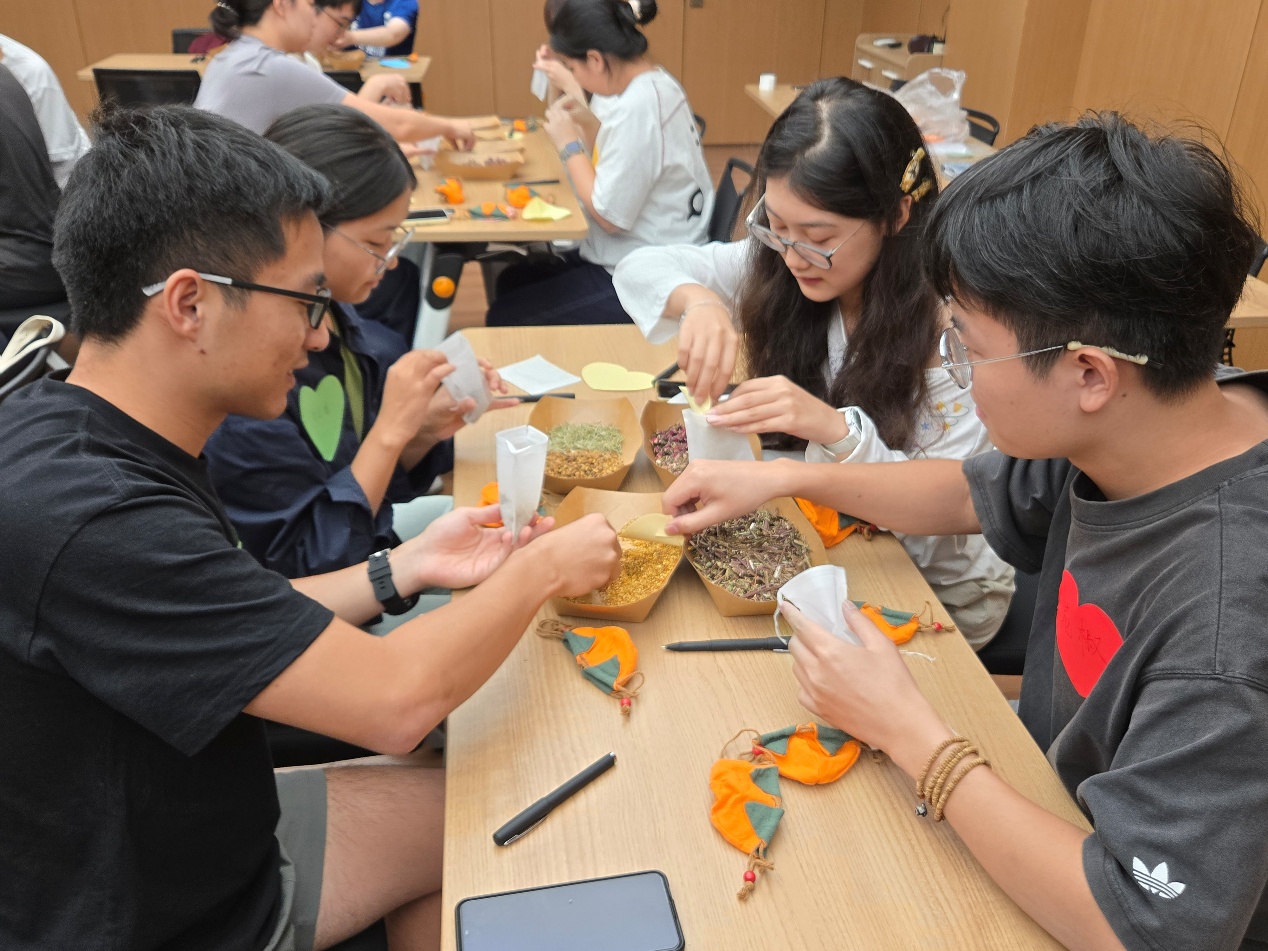 手作环节中,同学们专注地调配香料,填充柿子造型香囊。制作之余,大家还在小标签上写下“心语”,为香囊赋予独一无二的名字,让每一件作品都成为承载心意的情绪安抚工具。协作的默契与轻松的闲谈,现场满是温馨融洽的气息,同学们沉浸式感受紫金港的秋日氛围。
