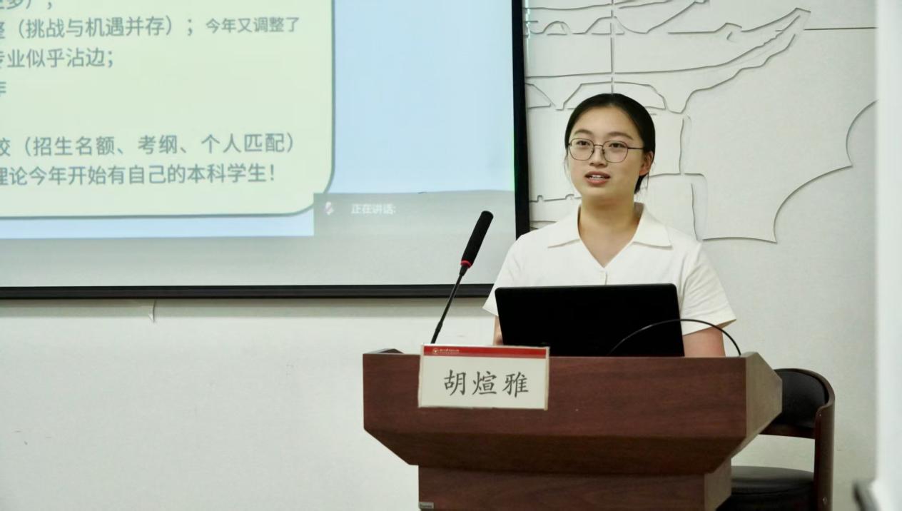 活动第一部分,胡煊雅学姐围绕院校选择,为大家提供了多个参考因素。随后她以备考时间为主线,明确了各个时间段应做的准备工作。在心理调试方面,学姐鼓励学弟学妹们寻找“学习搭子”,在合作与竞争中建立安全感,保持良好的生活作息,努力成为全面发展的六边形战士。她寄语大家:“要相信自己,付出会有回报的!”