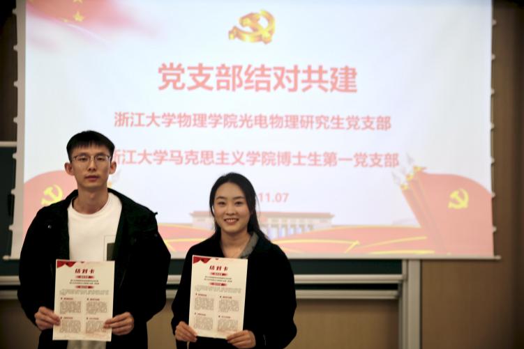 随后,光电物理研究生党支部与马克思主义学院博士生第一党支部进行结对仪式。光电物理研究生党支部书记符璇、马克思主义学院博士生第一党支部书记于小淳依次介绍了所在支部的人员构成及主要活动开展情况。
