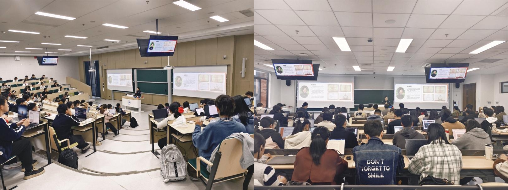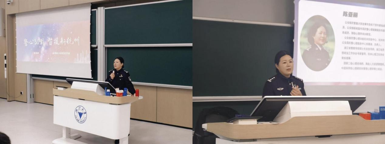 2025年11月12日上午和下午,公安部优秀心理教官、“杭州政法工匠”、杭州市人民警察学校陈亚丽老师应邀在“习近平新时代中国特色社会主义思想概论”教学班的课堂上,分别作“警心30载,智援新杭州”“新时代共同富裕社会背景下的个体心理建设”的专题讲座分享。讲座由浙江大学马克思主义学院桑建泉老师主持,200余名师生参与。
