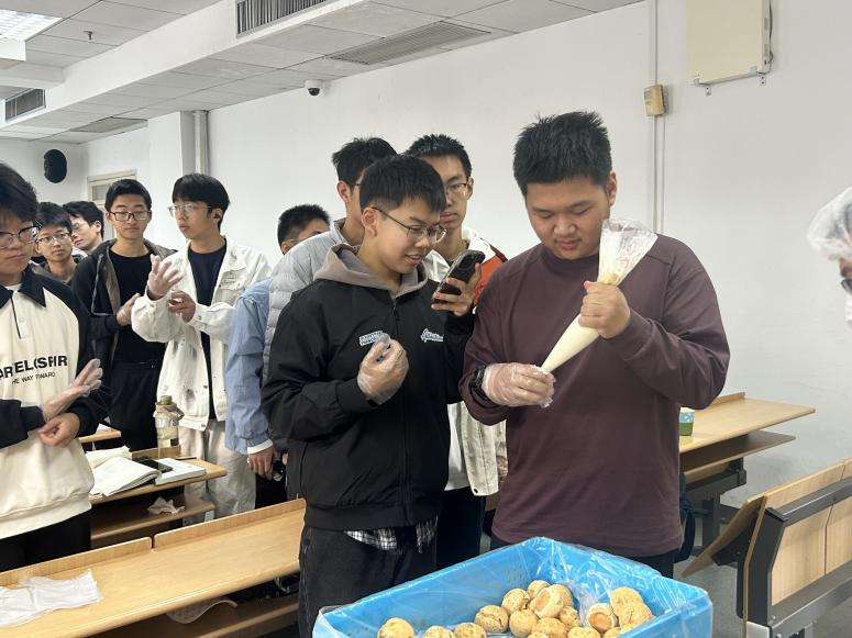 课程的第二阶段将气氛推向高潮。在同学们的期待中,面点师傅黄师傅现场展示了泡芙奶油的制作技艺。同学们纷纷动手实践,在黄师傅的耐心指导下学习面点技能,在协作中体验劳动的乐趣,在分享中感受团队的温暖。当亲手制作的泡芙出炉时,教室中弥漫的不仅是甜香,更是满满的成就感与喜悦。