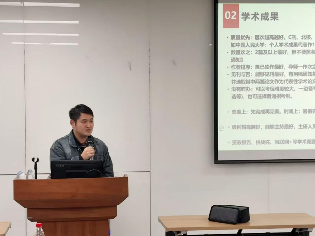 2024级马克思主义中国化方向硕士研究生王芷纯从政务实习、学生工作、学生助管、兼职家教四个方面分享了实习实践经验。她为同学们详细介绍了躬行计划、黄土地计划等社会实践活动的参与渠道和特点,并分享了自己在政务实习工作中的亲身经历和感悟。随后以浙江选调、江苏名优、湖南选调为例,详细分析了选调生考核的条件,提醒同学们重视并积极参与学生工作。最后,她向同学们分享了学生助管和兼职家教的报名方式和经验收获,祝愿各位同学拥有一个快乐充实、成果丰硕的硕士生涯。