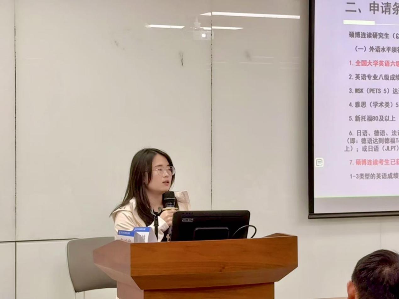 2025级马克思主义中国化方向博士研究生李婉茹以硕博连读申请为主题,为同学们详细介绍了硕博连读的申请时间、申请条件、考试时间与复习重点。她以问答的方式为同学们答疑解惑,细致入微地剖析了硕博连读的每一项申请条件,并分享了自己申请硕博连读的经验,为同学们准备复习、笔试和面试提供了参考和建议。最后,她建议有意向硕博连读的同学尽早准备,做好学业与生活的长远规划,方能在学术道路上步履从容。