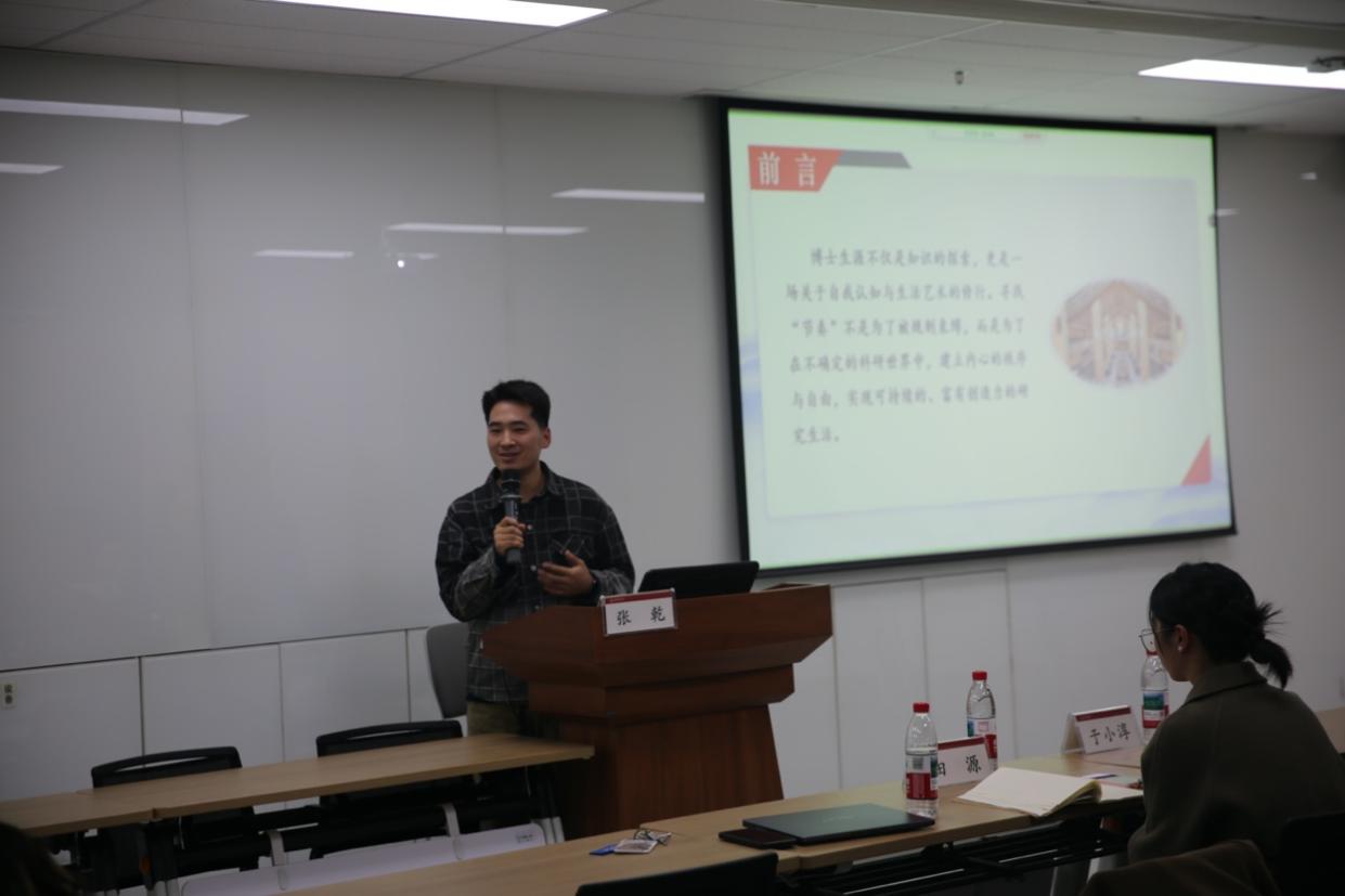 2024级马克思主义基本原理专业博士研究生张乾围绕“让生活围绕学术研究展开”“用学术研究提高生活质量”“寻找研究型生活的节奏”三大核心主题分享读博经验,为同学们提供了实用指引。关于第一个主题,他建议在生活中培养三大学术研究习惯,即关注学界动态、凝练学术选题、设置学术任务;关于第二个主题,他提出可通过学术研究结交学术知己、锻造专业技能、规划学术生涯,助力同学们更好地规划博士阶段的学习与生活;关于第三个主题,他谈到寻找“节奏”不是为了被规划束缚,而是为了在不确定的科研世界中,建立内心的秩序与自由,实现可持续的、富有创造力的研究型生活。