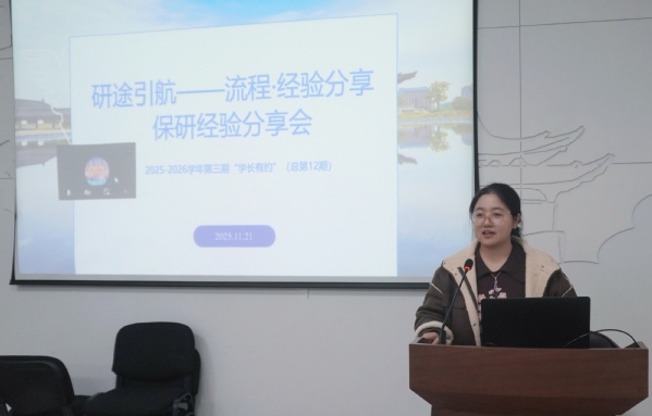 2025年11月21日下午,浙江大学马克思主义学院2025—2026学年第三期(总第12期)“学长有约”活动于成均苑2幢107教室举行。本次活动特邀干部教育学2025级硕士生武子昂学姐、马克思主义理论2022级本科生沈羽钦学长,围绕保研经验展开分享。活动由马克思主义学院学生会学术部承办,马克思主义学院团委职业发展与宣传部指导,由马克思主义理论2024级本科生付小轩主持。活动旨在帮助有意向保研的同学明晰流程、优化材料准备与面试策略,助力学业发展。