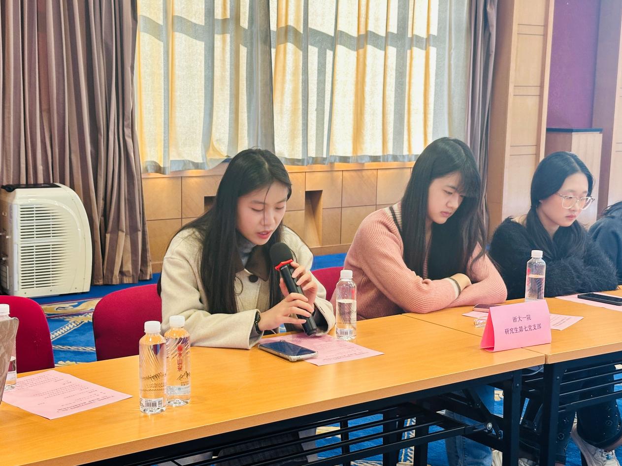 为深入学习贯彻党的二十届四中全会精神,落实学校第十五次党代会精神,夯实高质量基层党建基础,提升研究生党支部建设质量,促进研究生跨学科交流合作,2025年11月29日,马克思主义学院硕士生第三党支部、管理学院会计学研究生第二党支部、公共管理学院城管企管研究生党支部与浙大一院研究生第七党支部,共同前往浙大一院庆春院区开展学习贯彻党的二十届四中全会精神及“我为‘十五五’建言献策”联合共建主题党日活动。活动由浙大一院研究生第七党支部书记陈俊燃主持。