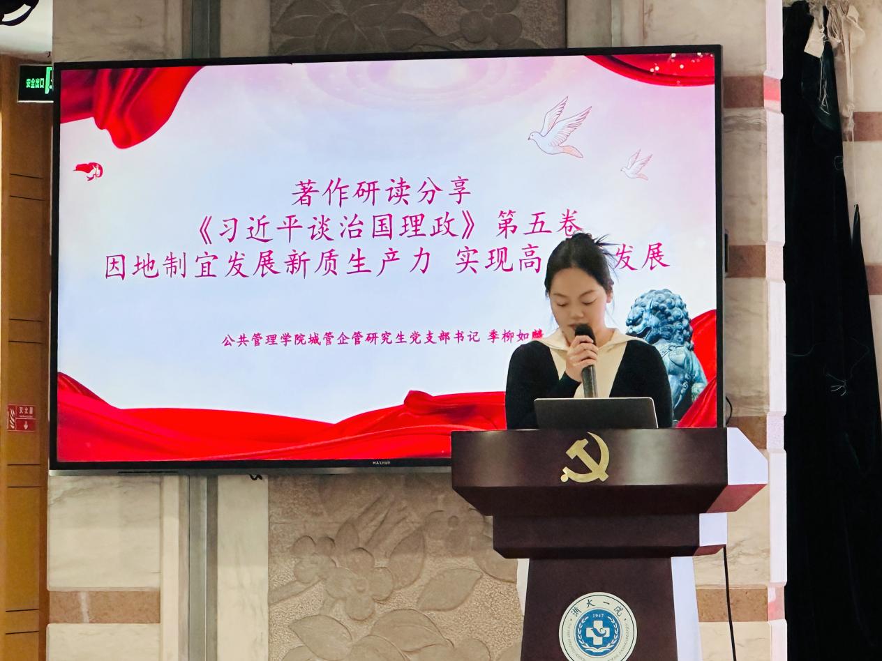 公共管理学院城管企管研究生党支部书记季柳如麟对《习近平谈治国理政》第五卷中的“因地制宜发展新质生产力 实现高质量发展”进行了研读分享。季柳如麟从理论渊源、实践探索、创新发展三个维度,分享了习近平经济思想形成与发展的过程,并特别指出了“新质生产力”的提出,正是这一思想在高质量发展阶段的创新突破。