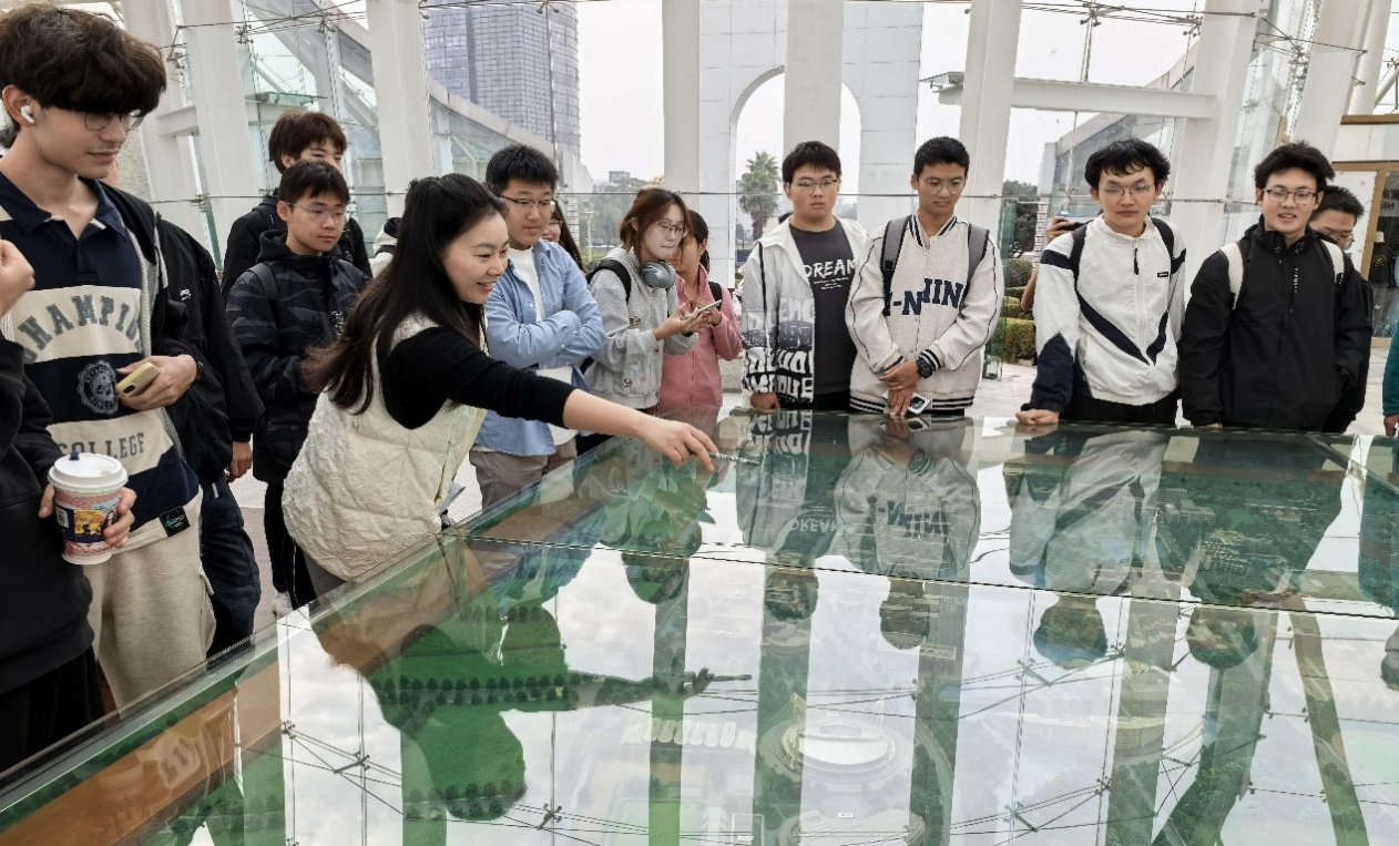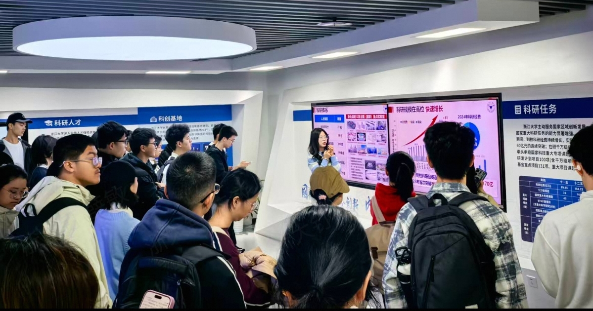 在科技创新馆,刘凤仪老师首先引导同学们观看了浙江大学各校区区域规划沙盘模型,了解各校区功能布局与学科特色。随后,师生走进紫金创业元空间,通过案例学习感知校友创业历程。在讲解员引导下,同学们进入核心展区,系统了解学校深入实施人才强校战略的成效——学校已建成54个国家科技创新基地、294个省部科技创新基地,强大的平台支撑为科研创新提供了坚实保障。