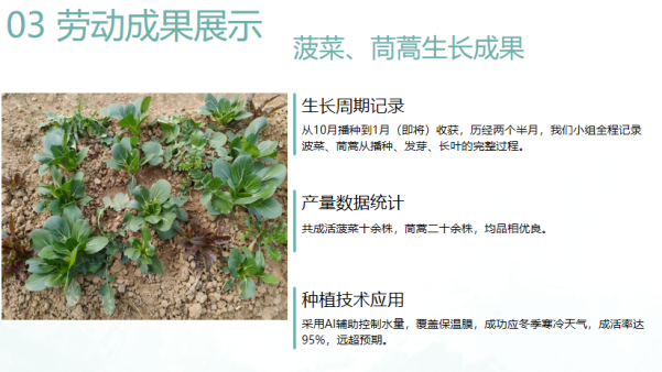 ·通过亲身劳动,小组成员不仅掌握了基本的农业技能,更在汗水与收获中体悟到劳动的艰辛与尊严;通过技术辅助,也更加深刻地理解了“新质生产力”在现实生活中的具体呈现。未来,只有在尊重劳动规律、坚持以人为本的前提下,推动技术与劳动的协同发展,才能真正实现农业现代化与人的全面发展。——“求是躬耕”第3小组
